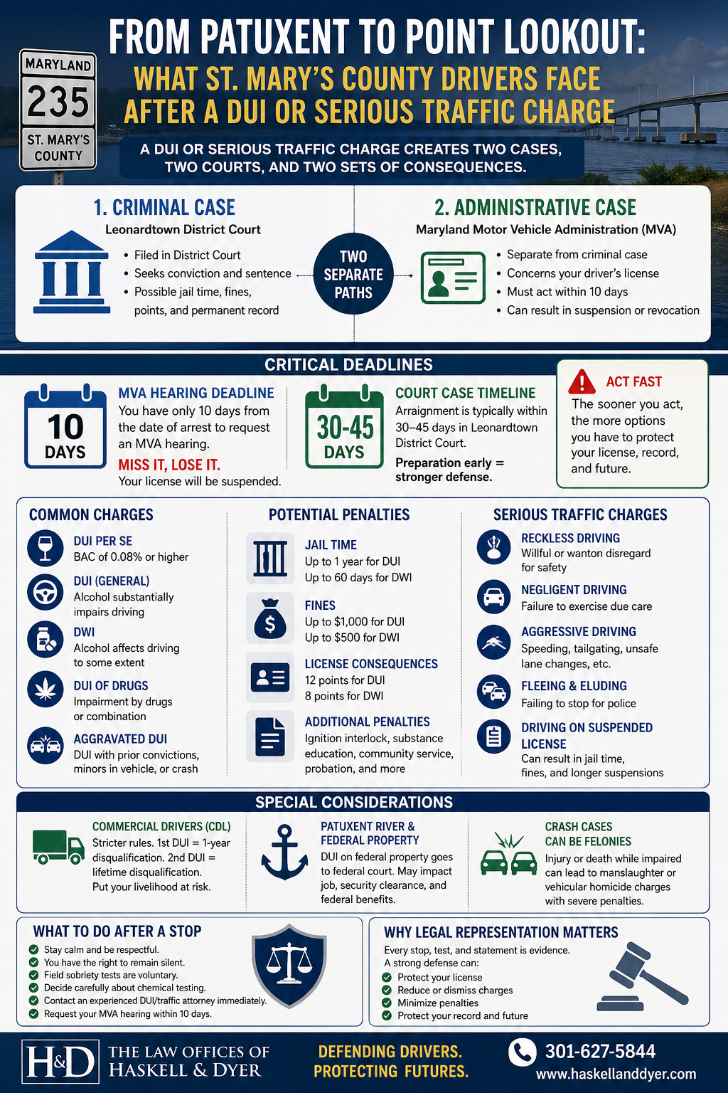 A DUI charge in Maryland is not one case but two. The criminal case proceeds in District Court, almost always at the courthouse on Courthouse Drive in Leonardtown. The administrative case proceeds before the Office of Administrative Hearings on behalf of the MVA. Both move on tight timelines. Both produce penalties. Both can be defended, but only when the driver acts before the early deadlines pass. Serious traffic offenses, including reckless driving, fleeing and eluding, and driving on a suspended license, follow a similar path through the same courthouse and can carry consequences nearly as severe.