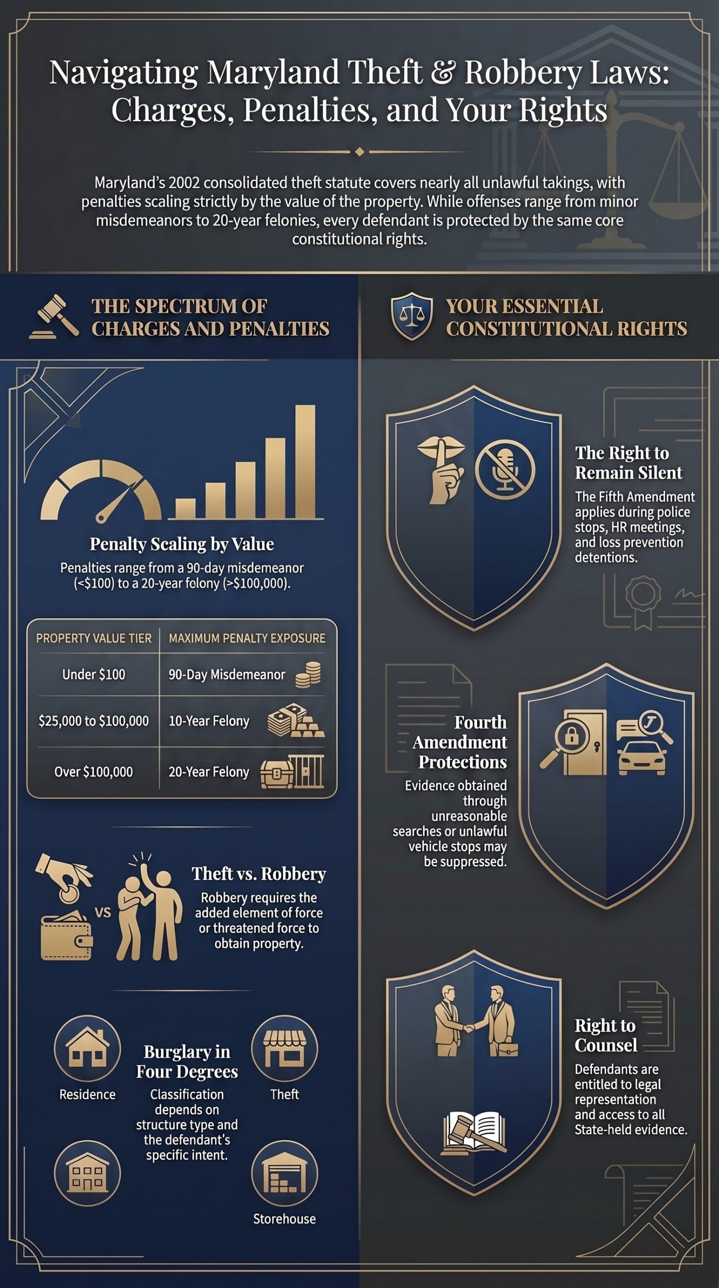 Maryland consolidated its theft offenses into a single statute in 2002, and Criminal Law § 7-104 now reaches almost every form of unlawful taking, conversion, or deception involving property. The penalty depends entirely on the value of what was allegedly taken: under $100 is a 90 day misdemeanor; over $100,000 is a 20 year felony. Robbery sits in a separate part of the code under § 3-402 and adds the element of force or threatened force. Armed robbery, carjacking, and burglary in four degrees each carry their own statutory frameworks, with felony exposure that climbs into decades of incarceration. Every defendant in every one of these cases retains the same set of constitutional and statutory rights from the moment of arrest, and those rights are usually the difference between a conviction and a defense.