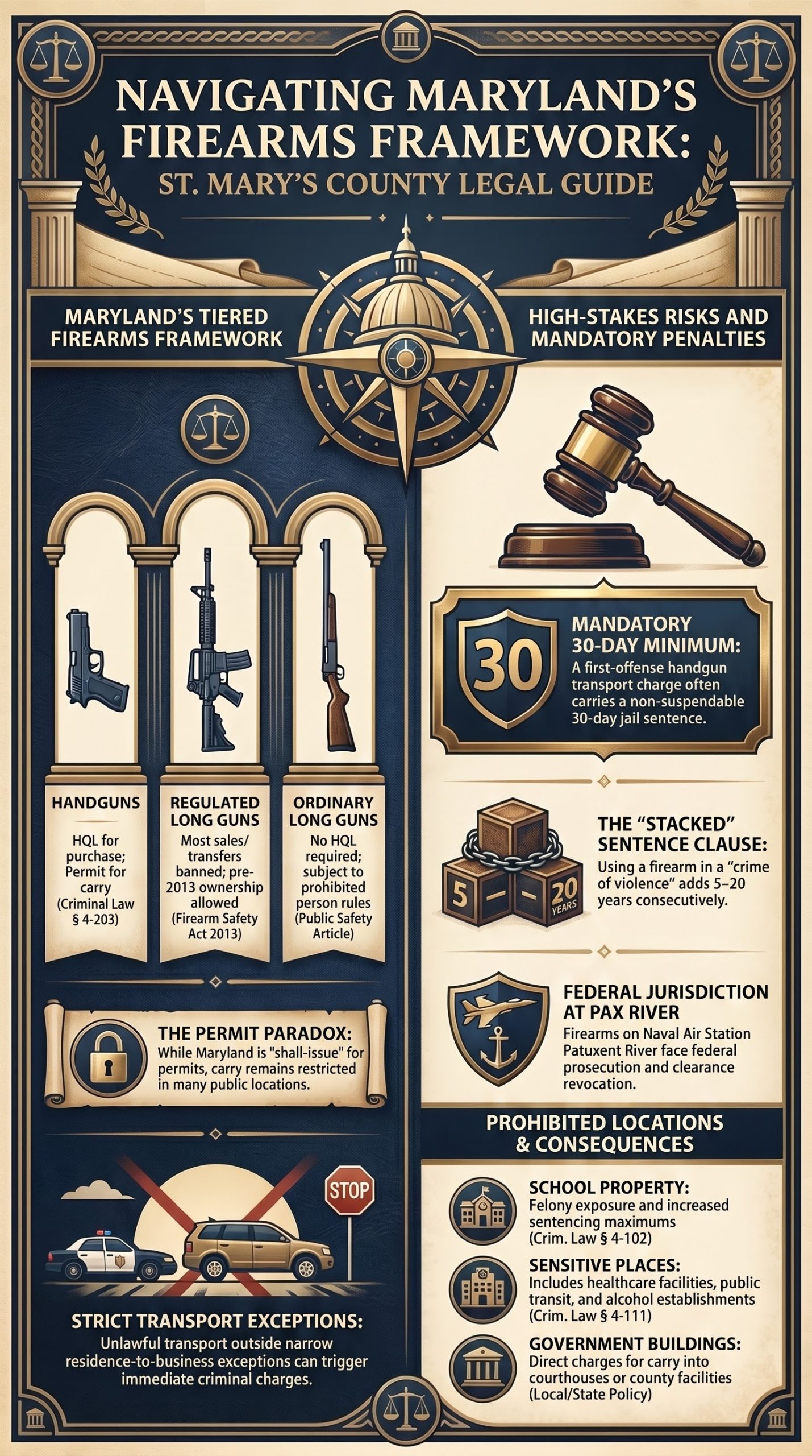 The result is a regulatory environment where lawful gun owners can find themselves charged for conduct they reasonably believed was permitted, and where defendants charged with unrelated crimes can find weapons counts stacked on top with their own mandatory minimums. This article walks through the full Maryland firearms framework as it applies in St. Mary’s County, including the procedural defense considerations specific to cases prosecuted at the Leonardtown courthouse. The goal is not to substitute legal counsel; it is to give people facing weapons charges (or family members of someone facing them) the framework needed to understand the stakes early enough to defend the case effectively.